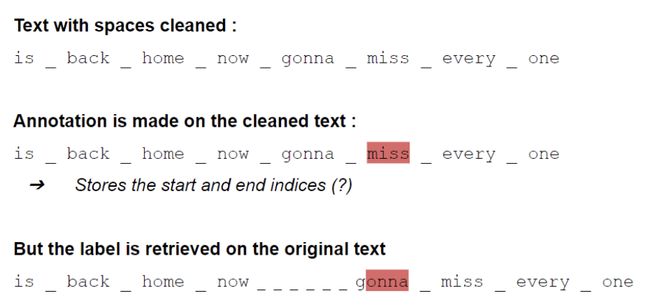 - since the label is retrieved on the original text, the dataset’s target labels are WRONG (if there were consecutive spaces before the labelled text)