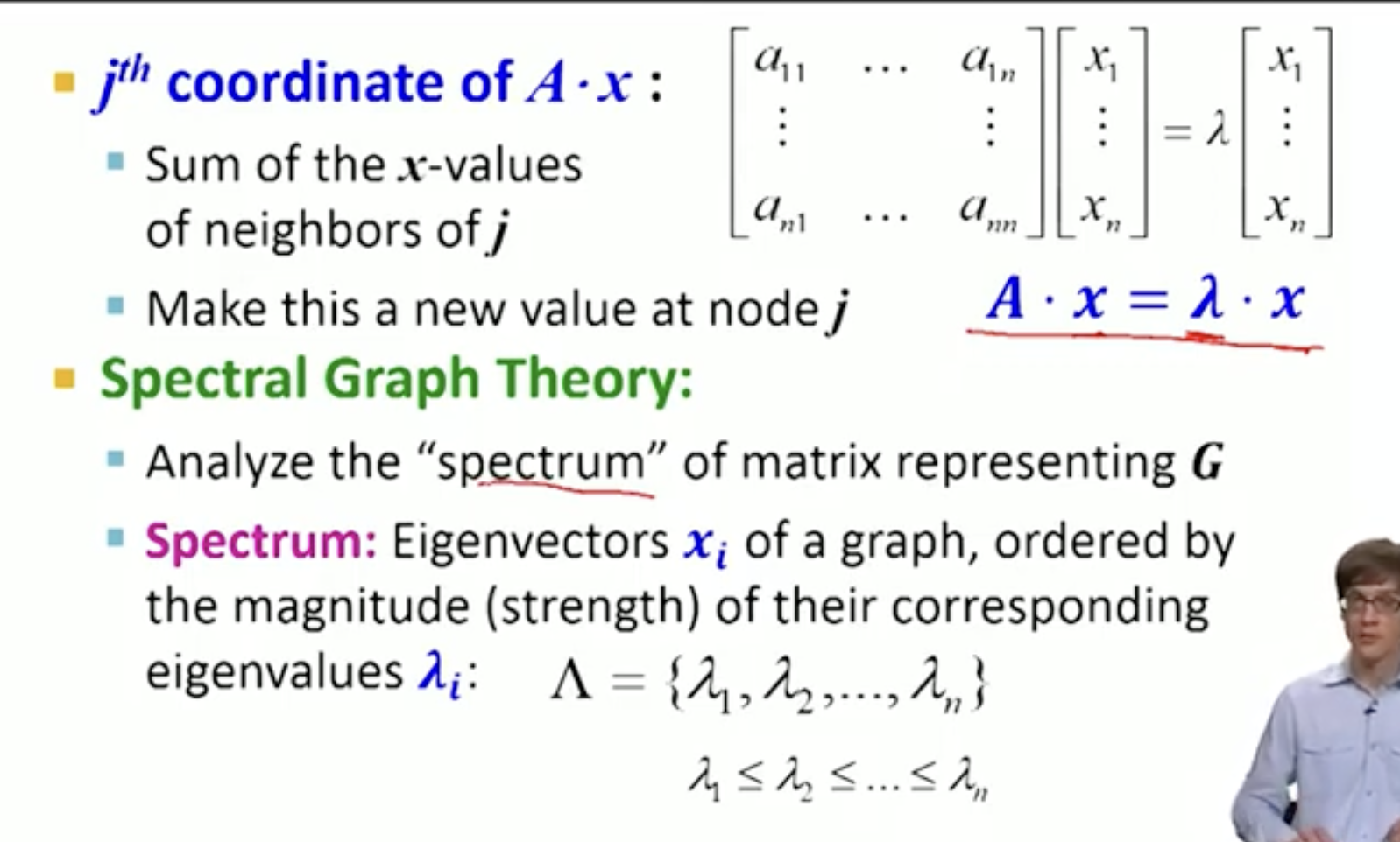 - The point of Spectral Graph Theory: what do the eigen values and eigen vectors (of the adj matrix) tell us about the graph