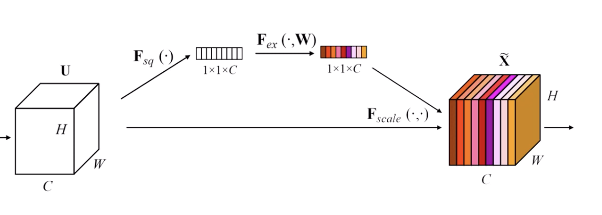 finally, we have the scale operator, which multiplies each coefficient of the sigmoid operation (i.e. the importance) with the corresponding channel in the output of the convolution: