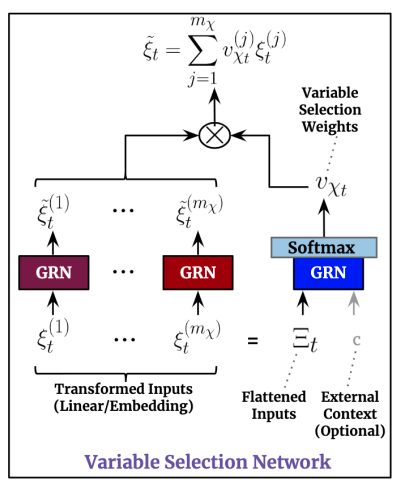 - so the GRN of the concatenated features selects which features to propagate. (kinda like the sigmoid in an LSTM)